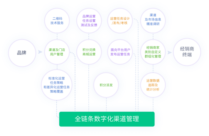 V积分基于消费品行业渠道特点,以物联网和大数据AI技术为支撑开发的一套完整的全链条数字化渠道管理平台。平台通过持续将消费品行业的渠道经营主体、流通数据、营销行为和运营工作全面在线化,通过人工智能AI辅助向平台用户以任务形式发布品牌运营活动。