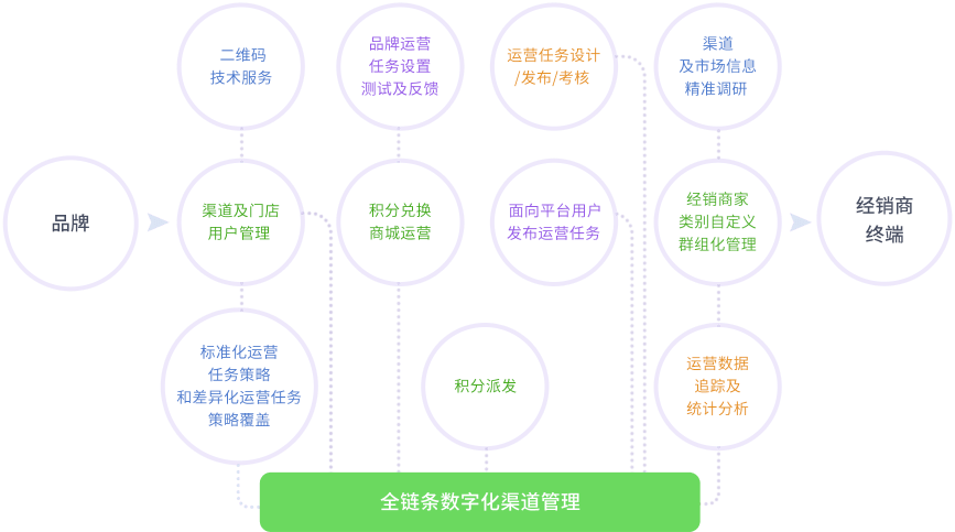 V积分基于消费品行业渠道特点,以物联网和大数据AI技术为支撑开发的一套完整的全链条数字化渠道管理平台。平台通过持续将消费品行业的渠道经营主体、流通数据、营销行为和运营工作全面在线化,通过人工智能AI辅助向平台用户以任务形式发布品牌运营活动。